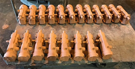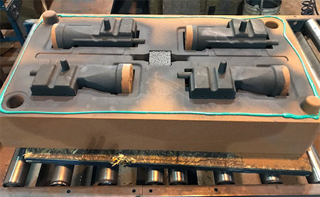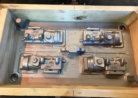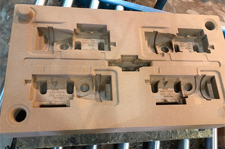 4-cavity cope/drag pattern from urethane tooling board and a 2-cavity urethane core box. This pattern is estimated to last up to 2000 molds.